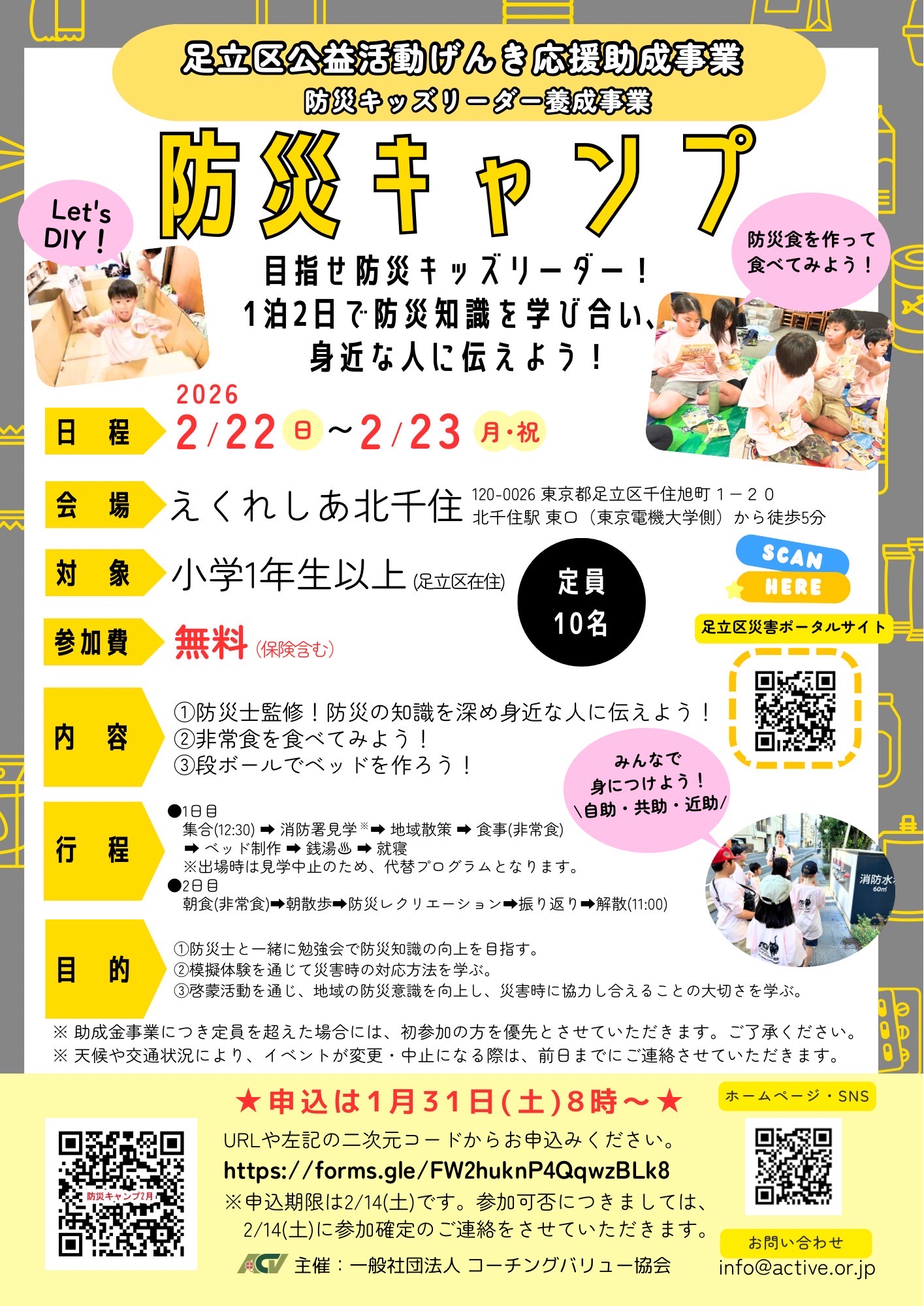 集合(12:30)➡消防署見学※➡地域散策➡食事(非常食)➡ベッド政策➡銭湯♨➡就寝