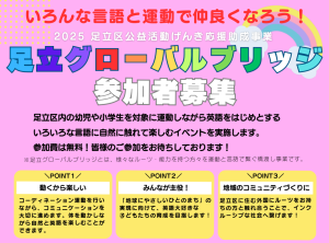 ★参加費無料★ 足立グローバルブリッジとは、様々なルーツ・能力を持つ方々を運動と言語で繋ぐ橋渡し事業です。足立区内の幼児や小学生を対象に運動しながら英語をはじめとする、いろいろな言語に自然に触れて楽しむイベントを実施しま […]